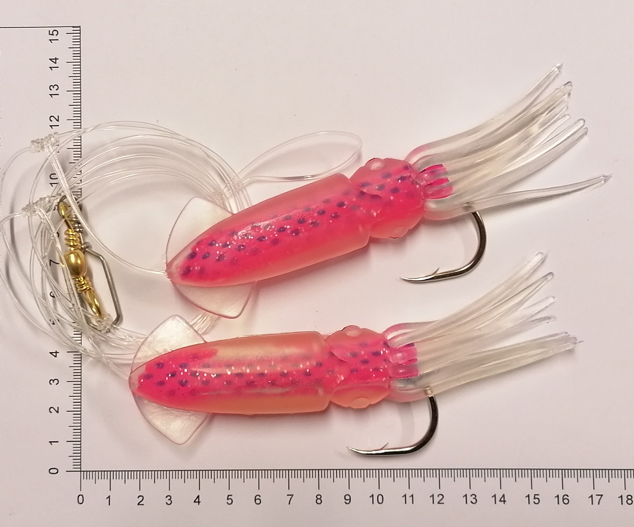 Forfang med 2 x Lyserøde squids og 10/0 kroge.